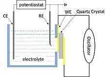 Electrochemical quartz crystal microbalance (EQCM) is the combination of electrochemistry and quartz crystal microbalance, which was generated in the eighties.[1][2][3] Typically, an EQCM device contains an electrochemical cells part and a QCM part.[4] Two electrodes on both sides of the quartz crystal serve two purposes.[4] Firstly, an alternating electric field is generated between the two electrodes for making up the oscillator.[4] Secondly, the electrode contacting electrolyte is used as a working electrode (WE), together with a counter electrode (CE) and a reference electrode (RE), in the potentiostatic circuit constituting the electrochemistry cell.[4] Thus, the working electrode of electrochemistry cell is the sensor of QCM.[2]