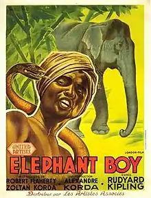 Elephant Boy is a 1937 British adventure film starring Sabu in his film debut.[2] Documentary filmmaker Robert J. Flaherty, who produced some of the Indian footage, and supervising director Zoltan Korda, who completed the film, won the Best Director Award at the Venice Film Festival. The film was made at the London Films studios at Denham, and in Mysore, India, and is based on the story "Toomai of the Elephants" from Rudyard Kipling's The Jungle Book (1894).[3]