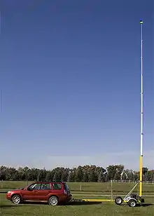 Where speed-of-operation, portability and the ability to hoist heavier professional camera equipment are the main goals, the masts can be mounted on a specialized trailer for easy transport. The trailer mounted system is quick to set up, since no assembly is required at the site. The mast pivots near its center of gravity, requiring very little effort to move it from the travel position to the vertical position for shooting. The telescoping mast can also be mounted on a large car or a van. Larger masts can to be attached to a 4x4 vehicle for greater stability for greater safety.