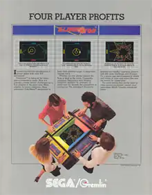 Eliminator is a multi-directional shooter space combat game, created and released by Sega/Gremlin in 1981. Similar to the monochrome Star Castle,[2] Eliminator uses color vector graphics and allows both cooperative and competitive multiplayer gameplay.[3] It is the only four-player vector game ever made.[2]