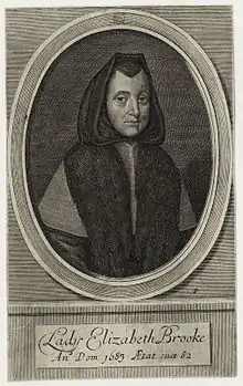 Elizabeth Brooke (January 1601 – 22 July 1683), also known as Lady Brooke or Dame Elizabeth Brooke, was an English religious writer, part of whose writing of Christian precepts survives,[1] and was matriarch of a landed manorial family in East Suffolk, East Anglia, during the English Civil War and Restoration periods.