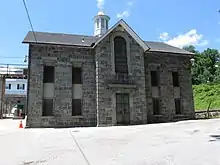 In 1878, Howard County opened its first permanent jail facility on Emory road in Ellicott City. The granite building was designed to house twelve inmates. The building is an example of Romanesque revival architecture. It was named "Willow Grove" or Emory Jail.[3] The 1878 commissioners' names are inscribed in the stone (Samuel Brown, Jerome C. Berry, and Willam Rowles).[4] Eight cells were originally constructed, including "dark cells" which held condemned prisoners awaiting morning executions.[5]