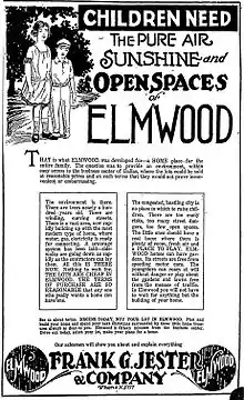 Elmwood began as the Tennessee Dairy founded by Lindsley Waters in 1907. With just 20 cows and covering 640 acres (2.6 km2), the dairy was a corporate operation and a modern facility that was the first in Dallas to deliver pasteurized milk in glass bottles,[2] even winning "most sanitary dairy farm" at the 1908 State Fair of Texas.[3] Remnants of the farm exist to this day, including a house on Brunner Avenue reputed to be the dairy foreman's quarters and portions of an old stone wall that divided the farm, which are visible along the 1700 block of S. Edgefield, near Elmwood Blvd. After a fire destroyed the farm in 1919, Mr. Waters moved production to Deep Ellum, Dallas, desiring a near-downtown location in order to expedite deliveries.[4] In 1924, real estate developer Frank G. Jester purchased the land from Southwest National Bank and platted the Elmwood Addition, selling quality homes in a "park-like" and "restful" setting just outside the southern boundary of Oak Cliff at the time. Construction slowed during the Great Depression but boomed in the post-war years, continuing until the 1950s when a much larger residential and retail development, Wynnewood, Dallas, opened to the east.