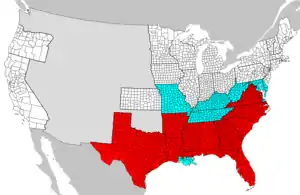 Areas covered by the Emancipation Proclamation are in red, slave-holding areas not covered are in blue