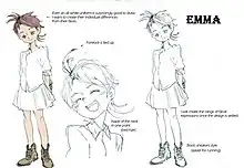 Being one of the smartest children living at the orphanage, Emma is considered as one of Grace Field House's three "Premium quality goods" along with Norman and Ray, at the third plant of the house. She was born on August 22, 2034. She has green eyes and short light orange hair that sticks up in all angles around her head with a single long lock of hair curving upwards from the right side of her head, resembling an antenna, and another smaller one from the base of her neck. Like Ray and Norman, Emma consistently gets perfect scores on her daily exams at the Grace Field orphanage.[7] At the beginning of the story on October 12, 2045, Emma is 11-year-old, she wears the uniform of Grace Field House: a shirt, a white skirt and brown shoes. An authentication number, 63194 is tattooed on her neck.[7]