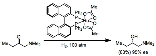 Transition metal catalysts have also been used with hydrogen gas as the stoichiometric reductant. Ketones with a chelating group undergo enantioselective reduction in the presence of a chiral Ru(BINAP) catalyst.[15] The configuration of the new stereocenter is predictable using the stereochemical model developed for hydrogenations employing BINAP (see equation (3) above).