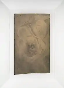 The young Corte’s approach to photography is characterized by its low-cost production and open-minded approach to the real, which one reviewer called that of "a tourist of existence".[53] His photography has also been defined a sort of "negative narcissism," experienced through re-defining the conventional concepts of "identity" and "dignity".[54] Typical of the latter are works that could be wrongly intended to "search for scandal".[55] For example, in some of them he is photographed standing precariously on the ledge of public buildings (Youthanasia, 1981; Cheese, 1981). Another self-portrait represents the artist’s face spattered with seminal liquid (Drawing [Sketch], 1982), and in another one someone urinates on his face (Idolatrine, 1981). Throughout the 1990s Corte would occasionally include photography in his sculptures or other plastic works to re-contextualize them in a wider multimedia context.