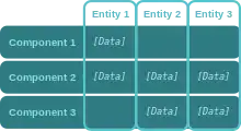 Unity's layout has tables each with columns of components. In this system an entity type is based on the components it holds. For every entity type there is a table (called an archetype) holding columns of components that match the components used in the entity. To access a particular entity one must find the correct archetype (table) and index into each column to get each corresponding component for that entity.
