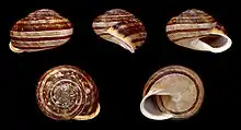 In this species the color of the shell is very variable. The background color can be whitish to greenish yellow, and the shell often has darker coloured bands or spots.[3] The ventral side of the shell frequently has two brown bands, and is whitish between the lowest band and the umbilicus.[3] The shell has 4-4.5 whorls.[3] The last whorl descends abruptly below the periphery of the shell.[3] The apertural margin is white, and is reflected (turned back)in adult shells, in juveniles this is true only on the columellar side.[3] The umbilicus is narrow and open in juveniles, only partly covered by the reflected columellar margin,; the umbilicus is however completely closed in adult shells.[3]