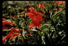 At the end of each erect branch is a glandular inflorescence bearing a bright red-orange tubular flower 2 or 3 centimeters long. A bunch of stamens and one long pistil protrude obviously from the mouth of the bloom, which is pollinated by nectar-feeding birds. The fruit is a hairy capsule about two centimeters long.