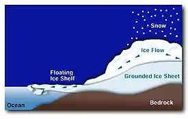 Waters at the ice tongue that receive the icebergs vary in depth from a minimum of 155–475 metres (509–1,558 ft).[19] Members of Robert F. Scott's Terra Nova Expedition first observed the glacier tongue calving in March 1911 when a 4 km section broke off during a gale.[1] A similar event in March 1990 produced a 100-million ton iceberg, 3.5 km long, from the glacier tongue.[20] In addition, observers note that the glacier tongue experienced a major calving event in the early 1940s.[21] Such calving along the glacier snout naturally leads to shortening, while icebergs released from the ice tongue sides contribute to the glacier's narrowing. The Erebus Ice Tongue produces flat-topped or tabular icebergs. It calved most recently in 2013, around a decade earlier than expected.[22]