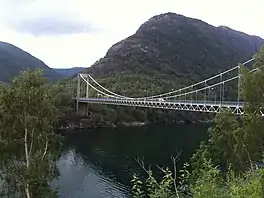 Erfjorden is a fjord in the municipalities Suldal and Hjelmeland in Rogaland county, Norway. The 16-kilometre (9.9 mi) long fjord begins at the small village of Tysse in Suldal and heads south past the village of Hålandsosen before making a sharp turn to the west before emptying into the larger Nedstrandsfjorden. The Erfjord Bridge crosses the fjord, just north of Hålandsosen. The innermost part of the fjord (north of the bridge) is sometimes referred to as the Tyssefjorden.[1][2]