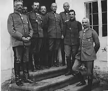 On 8 July 1913 Falkenhayn became Prussian Minister of War succeeding Josias von Heeringen, who was considered to be inactive.[6] During the Zabern Affair, Falkenhayn as Minister of War, was part of the conference to end the affair.[7] During the July Crisis, he was at the meeting on 5 July 1914 when Germany announced to Austria-Hungary its support for war. Like most German military leaders, he did not expect a great European war but he soon embraced the idea and joined others pushing for Kaiser Wilhelm II to declare war. Falkenhayn wanted early mobilisation since the Kaiser started to secure his palace; when the war began Falkenhayn viewed this with enthusiasm.[8] He assured the Kaiser that the German Army was ready for the conflict.[9] He told the chancellor, Theobald von Bethmann Hollweg that "Even if we perish over this, it will still have been worth it".[8][10][11]