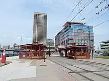 ![]() Erie Canal Harbor station platforms with Seneca One Tower in the background, during reconstruction in December 2023. | |||||||||||