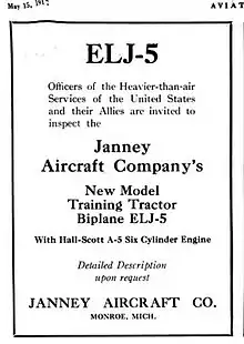 - ↑ "Officers of the Heavier-than-air Services of the United States and their Allies are invited to inspect the Janney Aircraft Company's New Model Training Tractor Biplane ELJ-5". "Aviation Week. May 1, 1917. Retrieved November 17, 2017.