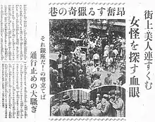 "The Sada Abe Panic" May 1936. Newspapers of the time reported on crowds gathered in the streets following news of the Sada Abe Incident, noting the nonsensical nature of the incident.