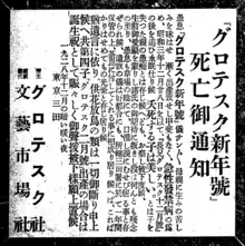 A newspaper headline announcing the ban of Hokumei Umehara's magazine Grotesque. Umehara was extolled as the "King of Underground Publishing" in ero guro nansensu culture. (December 1928)