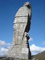 Officers of the mountain brigade considered to erect a cenotaph for the golden eagle, the symbol of the brigade, from stone tailings of the fortification Gondo. Baumann had good connections to the commanders of the brigade. Brigadier Hans Bühler was married to his second cousin, and he knew the colonel of the engineer corps, Werner Grimm, since his youth in Berne. Baumann got the job to explore the possibilities and his proposal of an over nine meter high monument made of the tailings pleased the two superiors. Baumann described his approach in the following way:[7]