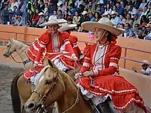 Escaramuza charra is the only female equestrian event in the Mexican charrería. The escaramuza means "skirmish" and consists of a team riding horses in choreographed synchronized maneuvers to music.[1][2][3] The women ride side-saddle and wear traditional Mexican outfit that include sombreros, dresses, and matching accessories. A team consists of 16 women, but only 8 ride at a time.[4] The routine is practiced in a lienzo, or a circular arena.[1]