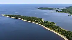 Aerial view of a partially drowned esker at Billudden in northern Uppland, Sweden. The shape is modified by coastal processes.