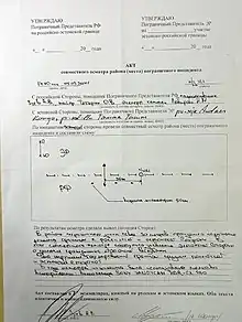 According to the Estonian Internal Security Service, immediately after the incident Estonian investigators and Russian border guards jointly investigated the scene, and agreed that the evidence showed that there were signs of a violent struggle and impact craters from the smoke grenades on the Russian side (in both protocols), with multiple footprints in a band of raked sand suggesting that a group of men crossed from and then returned to the Russian side (only in Estonian protocol).[6][8][9] On 10 September, Estonian newspapers published a bilingual protocol of border violation, signed on 5 September by Estonian and Russian border guards who had inspected the place immediately after the incident.[10] Both versions of the protocol indicates the direction of the incursion with a double-ended arrow across the border 30 metres from a border post and three craters 50 cm in diameter on the Russian side of the border. The Russian version acknowledges the Estonian version as equally authentic. However the protocols appear to be not identical. The Estonian version explicitly mentions that the border breach originated in the Russian side to the Estonian one and then back. But the Russian version of the protocol does not contain any detail about the direction of the border breach.
