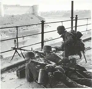 The 18th Army resumed their advance in Estonia by working in cooperation with the Forest Brothers. The joint Estonian-German forces took Narva on 17 August.[65] By the end of August, Tallinn was surrounded, while in the harbor was the majority of the Baltic Fleet. On August 19, the final German assault on Tallinn began. The joint Estonian-German forces took the Estonian capital on August 28. The Soviet evacuation of Tallinn carried heavy losses. On that day, the Red flag shot down earlier on Pikk Hermann was replaced with the flag of Estonia. After the Soviets were driven out from Estonia, German troops disarmed all the Forest Brother groups.[65][66] The Estonian flag was replaced shortly with the flag of Germany.