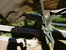 The halter is tightened with a side closing knot.[6][2] A lead rope can be attached to the attachment knot under the trough, and reins to the same point, or to either side of the noseband.[6] It's also possible to make one of these, from rope.[8][9] The diameter of the rope, or cord, defines the potential severity of the halter on the horse.[3]: 10