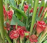 Etlingera elatior (also known as torch ginger, ginger flower, red ginger lily, torchflower, torch lily, wild ginger, honjé, combrang, kecombrang, Cekala (Sumatra), bunga kantan, Philippine wax flower, ගොඩ ඕලු (goda olu), ගොඩ නෙලුම් (goda nelum), සිද්ධාර්ථ (siddartha), 火炬姜 (pinyin: Huǒjù jiāng), Indonesian tall ginger, boca de dragón, rose de porcelaine, dala (ดาหลา), and porcelain rose) is a species of herbaceous perennial plant in the family Zingiberaceae; it is native to Indonesia, Thailand, Malaysia and New Guinea.[1]