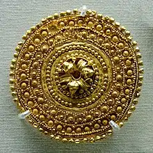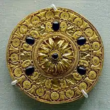 Ear-stud decorated with a rosette surrounded by concentric bands, globules and flowers. Gold with vitreous glass paste insets, 530–480 BC. British Museum.