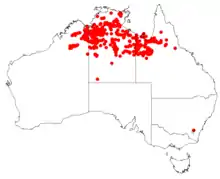 Silver box is found in open savannah woodland communities on low limestone hills and on low-lying flats and grows best in sandy soils. It is widely distributed across northern Australia from the Kimberley region of Western Australia to north-western Queensland. In the Kimberley region of Western Australia it is found to the east of the KWunaamin Miliwundi Ranges in the Shire of Halls Creek and Shire of Wyndham-East Kimberley. In the Northern Territory, it is found in the from Katharine to about Tennant Creek, including the Victoria Daly and Roper Gulf Regions and Arnhem Land. In Queensland it occurs as far east as Forsayth and Einasleigh and as far south as Dajarra.[4][8]