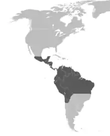 Eulaema meriana is native to Panama, Colombia, Venezuela, the Guianas, Ecuador, Peru, Bolivia and Brazil, or most commonly the New World tropics. It is found in forests in the Amazon basin but is replaced in the Atlantic coastal forest by Eulaema niveofasciata and Eulaema flavescens.[7] In general, members of the Euglossini tribe are found mostly in the tropical areas of the Americas, even around Mexico or Argentina. The genus Eulaema itself ranges from central Mexico to northern Argentina.[3]