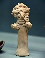According to contextual data, these figurines are attested in some Middle Euphrates sites during the mature Iron Age. In archaeological contexts, such artefacts usually come from upper layers dating from the Neo-Assyrian period (7th century BCE), but the origin of this production may be identified at the end of Neo-Syrian period (mid/end-8th century BCE). Indeed, at the site of Karkemish the major part of finds belonged to Iron III layers, while a minor part was retrieved in Iron II ones.[8]