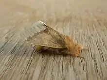 The wingspan is about 50 mm. Adults are hairy and brown, with a broad white band along the terminal area of each wing and a dark brown body.