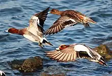 The Eurasian wigeon is a bird of open wetlands, such as wet grassland or marshes with some taller vegetation, and usually feeds by dabbling for plant food or grazing, which it does very readily. It nests on the ground, near water and under cover. It is highly gregarious outside of the breeding season and will form large flocks. They will join with flocks of the American wigeon in the United States, and they also hybridize with them.[5] This is a noisy species. The male has a clear whistle that sounds like: "pjiew pjiew", whereas the female has a low growl: "rawr".