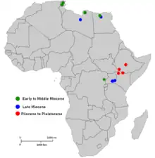 Other remains of Euthecodon are known from the Miocene Beglia Formation (Tunisia),[11] Early Miocene Rusinga Island (Lake Victoria),[7] the Albertine Rift (Congo),[12][13] Ombo (Kenya) [14][7] and the Messinian to Zanclean Sahabi Formation (Libya).[11][6][15] Despite this abundance in northern Africa around the Mediterranean, no fossils of Euthecodon have ever been found outside Africa.