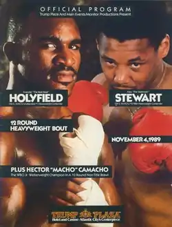 Holyfield had dispatched heavyweight contender Adílson Rodrigues in his previous fight in July 1989 to retain both the WBC Continental Americas heavyweight title and his number one ranking in the heavyweight division.[1] For his next fight, Holyfield's team negotiated with a number of heavyweight contenders including George Foreman, Tim Witherspoon, Orlin Norris and Alex Stewart.[2] Holyfield's promoter Dan Duva agreed to give Foreman a $1.5 million purse, but Foreman would not sign the contract at the time as he was also engaged in talks with Don King about a title fight with Mike Tyson. Duva claimed that Foreman only wanted to fight "easy guys", though Foreman stated " I'd like to know about Tyson before I get serious about Holyfield."[3] In August, it was announced that Holyfield would meet Stewart on November 4 instead.[4] Stewart entered the fight with Holyfield with a perfect 24–0 record with all 24 wins coming by way of knockout, though nearly all his opponents were unheralded journeyman. Nevertheless, Stewart was the number two ranked heavyweight by the WBA behind only Holyfield and was earning a $225,000 purse, the largest payday of his career up to that point.[5]