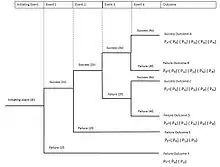 The event tree diagram models all possible pathways from the initiating event. The initiating event starts at the left side as a horizontal line that branches vertically. the vertical branch is representative of the success/failure of the initiating event. At the end of the vertical branch a horizontal line is drawn on each the top and the bottom representing the success or failure of the first event where a description (usually success or failure) is written with a tag that represents the path such as 1s where s is a success and 1 is the event number similarly with 1f where 1 is the event number and f denotes a failure (see attached diagram). This process continues until the end state is reached. When the event tree diagram has reached the end state for all pathways the outcome probability equation is written.[1][3]