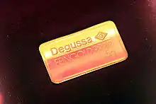 During World War II, one of Degussa's (Deutsche Gold- und Silber-Scheide-Anstalt, "German Gold and Silver Refining") subsidiaries, Degesch (translation: German Corporation for Pest Control), was the main manufacturer and distributor of the chemical Zyklon B, which was used to murder people in gas chambers of German extermination and concentration camps during The Holocaust.[5] Gold dental fillings, which had been forcefully removed from the mouths of concentration-camp inmates, were processed by Degussa.[5] The company's partnership Deutsche Gasrusswerke (DGW) employed Jewish slave laborers at Gleiwitz concentration camp, a subcamp of Auschwitz. Degussa estimated its war losses at 111 million Reichsmark, almost US$0.5 billion in 2012 dollars.[6]
