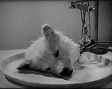 ![]() Screenshot from the film showing the dog's head attached to Brukhonenko's autojektor | |