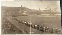 The WUP team was subsequently defeated 38–0.[16] The WUP football team began playing games more regularly at Exposition Park around 1900, occasionally playing in other local venues.[17] Prior to the 1903 season, Arthur Mosse was recruited from the University of Kansas to become the team's new coach. In addition to players that Mosse brought with him, WUP also recruited players from Geneva College to play on the team. Mosse's first season was a disappointment as the WUP football team went 0–8–1 and supporters of the team disbanded leaving the team $500 in debt. George Hubbard Clapp then organized a voluntary $5 "athletic fee" to be paid by students in order to allow the debt to be repaid and the school's football team to play home games at Exposition Park during the next season in order to give the WUP team a more permanent and stable home. Mosse and university officials then obtained a lease to play at Exposition Park during the fall from Pirates owner Barney Dreyfuss for 20% of the admission fee. The 1904 WUP team, the first full season in which WUP played at Exposition Park, saw WUP achieve a remarkable turnaround that included a 10–0 record in which they outscored opponents 407–5 and finished second in the state behind the University of Pennsylvania.[18] Prior to home games at Exposition Park, WUP students would organize parades through downtown streets prior to marching across a bridge to the game. A gong, used to announce the beginning of Pirates games, was also sounded prior to the opening kickoff of WUP football contests.[19]