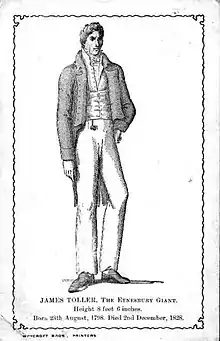 James Toller was born in Eynesbury in 1798. He grew to be 8 ft 1+1⁄2 inches (2.475m) tall, although some sources claim 8 ft 6in (2.591m). His parents were of ordinary stature. By the age of eighteen years he had grown to be over eight feet (2.44m) in height, and his feet were 15 inches in length.