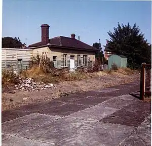 The Western Region of British Railways closed the station to passenger traffic on 18 June 1962 and to goods on 26 April 1965.[1][2][3][14] An enthusiasts' special organised by the Locomotive Club of Great Britain called at the closed station in April 1970.[15] BR closed the line to goods traffic on Monday 2 November 1970, after which the local council asphalted over the level crossing "with almost indecent haste".[16]