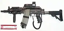 ![]() The Mini-Beryl with a long receiver MIL-STD-1913 rail, vertical grip and telescopic stock. | |