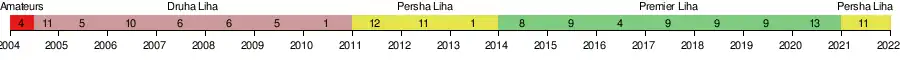 (Druha Liha)11 28 8 3 17 33 54 27 2005–06 5 24 13 2 9 42 28 41 1/32 finals 2006–07 10 28 8 8 12 35 41 32 1/16 finals 2007–08 6 34 19 6 9 66 41 63 1/16 finals 2008–09 6 34 16 9 9 55 32 57 1/32 finals 2009–10 5 26 15 4 7 45 28 49 1/64 finals[18][19] 2010–11 1 22 17 2 3 45 15 53 1/32 finals Promoted 2011–12 2nd