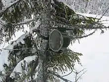 A Fordonsmina 14 rigged on a tree.