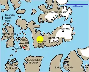 The station is located on Devon Island, a Mars analog environment and polar desert, approximately 165 kilometres (103 mi) north east of the hamlet of Resolute in Nunavut, Canada. The station is situated on Haynes Ridge, overlooking the Haughton impact crater, a 23 km (14 mi) diameter crater formed approximately 39 million years ago (late Eocene).[4] The location is approximately 1,600 km (990 mi; 860 nmi) from the Geographic North Pole and approximately 1,500 km (930 mi; 810 nmi) from the Magnetic North Pole (as of 2010).