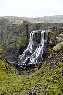 Fagrifoss is a waterfall located in the Highland in Iceland. It is almost on the road leading to Lakagígar craters on road F206.24 km (15 mi) from Kirkjubæjarklaustur and 40 km (25 mi) from Laki. Access to the waterfall requires the crossing of a river ford, for which a 4x4 vehicle is needed.[1]