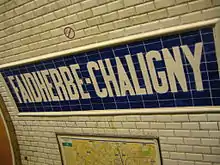Faidherbe–Chaligny (French pronunciation: [fedɛʁb ʃaliɲi]) is a station of the Paris Métro, named after the streets of Rue Faidherbe and Rue Chaligny.