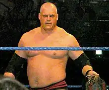 Kane then formed a tag team with Rob Van Dam, with the duo eventually winning the World Tag Team Championship from Chief Morley and Lance Storm in a triple threat elimination match (also involving The Dudley Boyz) on the March 31 episode of Raw.[53] After they lost their World Tag Team Championship to La Résistance at Bad Blood, Triple H offered Kane a spot in his stable Evolution. Raw co-general manager Stone Cold Steve Austin offered Kane the opportunity to face Triple H for the World Heavyweight Championship if he rejected Triple H's offer; however, co-general manager Eric Bischoff insisted that if Kane lost the match, he would unmask. Kane accepted Austin's offer and challenged Triple H the following week in Madison Square Garden. Triple H won the match following interference from his stablemates, and on the June 23, 2003, episode of Raw, Kane removed his mask and chokeslammed Van Dam, turning heel in the process.[77] The unmasking rendered Kane emotionally unstable, and in an interview with Jim Ross on the July 14 episode of Raw, Kane attacked Ross and set him on fire.[78] He later attacked Linda McMahon on the Raw stage the following week.[79] This action sparked a feud between Kane and Shane McMahon, Linda's son, with Kane defeating Shane in a Last Man Standing match at Unforgiven and an ambulance match at Survivor Series.[80][81] During the latter event, Kane also interfered in a Buried Alive match between Vince McMahon and The Undertaker, helping McMahon bury The Undertaker and win the match.[81] In January 2004, Kane took part in the Royal Rumble match; he was eliminated when he heard the bell toll from The Undertaker's entrance music, distracting and distressing Kane, and enabling Booker T to eliminate him. Over the following weeks, Kane repeatedly insisted that The Undertaker was "dead", only to be met with various paranormal incidents such as a rainstorm localized over the ring in which he stood. The Undertaker finally returned at WrestleMania XX (again sporting his "Deadman" persona) with Paul Bearer at his side, defeating Kane.[82]