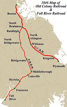 The first segment opened between Myricks and downtown Fall River on June 9, 1845.[5][6] In April 1846, the name was simplified to "Fall River Railroad".[1][7] An extension from Myricks to Middleborough opened in mid-1846. A separate section of the line opened south from South Braintree to Randolph on August 26, 1846.[8][9] That section was extended to North Bridgewater by October.[10] The remaining portion between North Bridgewater and Middleborough opened on December 21, 1846, completing the line.[11][12]